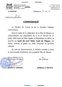 Cette mesure s’inscrit dans le cadre de la célébration de la fête de Pâques et conformément aux dispositions de la loi n° 90-019 du 27 juillet 1990 fixant les fêtes légales en république du Bénin. Elle concerne aussi bien les administrations publiques que les structures privées, dans le respect de la réglementation en vigueur.