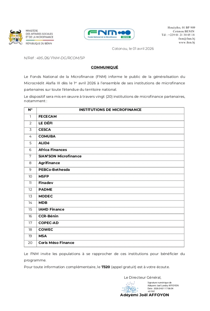 Le Fonds National de la Microfinance (FNM) annonce la généralisation du programme Microcrédit Alafia III à partir du 1er avril 2026. L’information à été annoncée à travers communiqué en date du 1er avril 2026, signé par son Directeur général Adeyemi Joel Landry Affoyon. Le Fonds National de la Microfinance (FNM) informe les populations béninoises de l’extension du dispositif Microcrédit Alafia III à l’ensemble du territoire national. Selon le document, ce programme sera désormais mis en œuvre par vingt (20) institutions de microfinance partenaires. L’objectif de cette généralisation est de faciliter l’accès au crédit à faible coût, notamment pour les femmes, les jeunes et les acteurs du secteur informel. Ceci dans le but de stimuler les activités génératrices de revenus et soutenir le développement économique local.