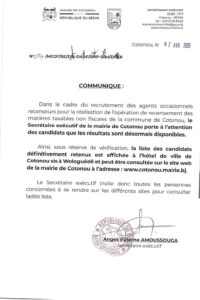 À travers un communiqué en date du 7 avril 2026, la mairie de Cotonou informe que les résultats du recrutement des agents occasionnels recenseurs sont désormais disponibles.