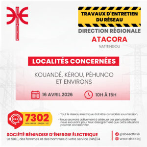 La Société béninoise d’énergie électrique (SBEE) informe ses abonnés d’une interruption temporaire de la fourniture d’électricité prévue ce jeudi 16 avril 2026 dans plusieurs localités du pays.