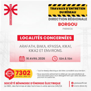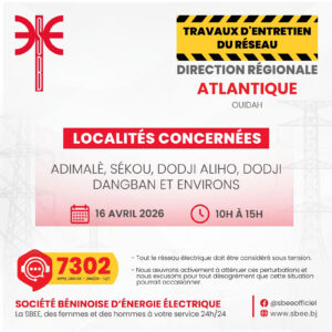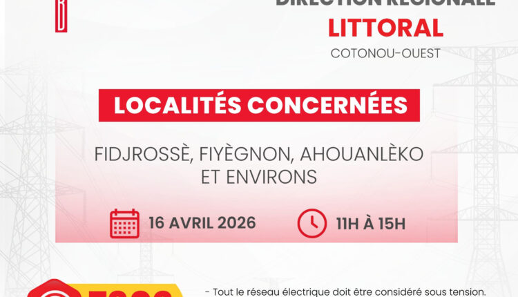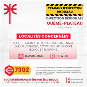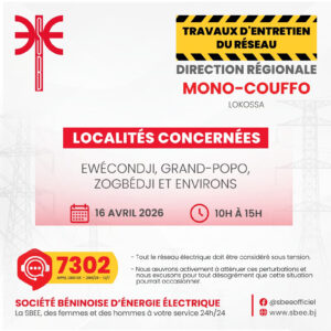 La Société béninoise d’énergie électrique (SBEE) informe ses abonnés d’une interruption temporaire de la fourniture d’électricité prévue ce jeudi 16 avril 2026 dans plusieurs localités du pays.