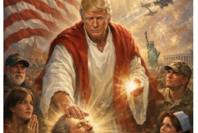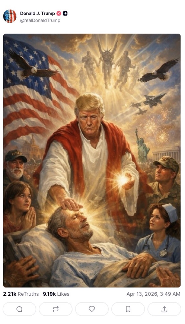 Une mise en scène jugée provocatrice. L’image montrait le dirigeant américain vêtu d’une toge, auréolé de lumière, posant la main sur un homme alité, dans une composition reprenant les codes iconographiques chrétiens. Des symboles patriotiques: aigle, drapeau, statue de la Liberté y étaient également intégrés, brouillant les frontières entre sacré et politique.