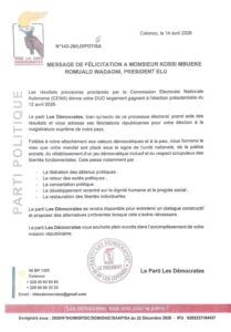 En conclusion, le parti Les Démocrates adresse ses vœux de réussite à Romuald Wadagni dans l’exercice de ses futures responsabilités à la tête de l’État. Il se dit également disponible pour engager un dialogue constructif et formuler des propositions alternatives dans l’intérêt national.