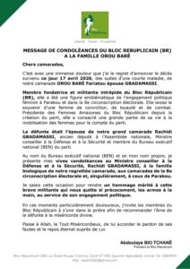 Le Bloc Républicain (BR) traverse un moment de deuil. Ce vendredi 17 avril 2026, la formation politique a annoncé, la disparition de Fariatou Orou Barè, épouse Gbadamassi, membre fondatrice et militante engagée, emportée parune courte maladie.