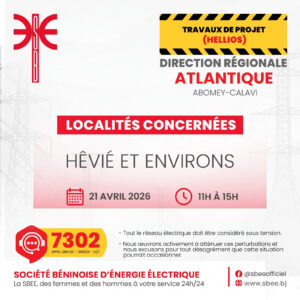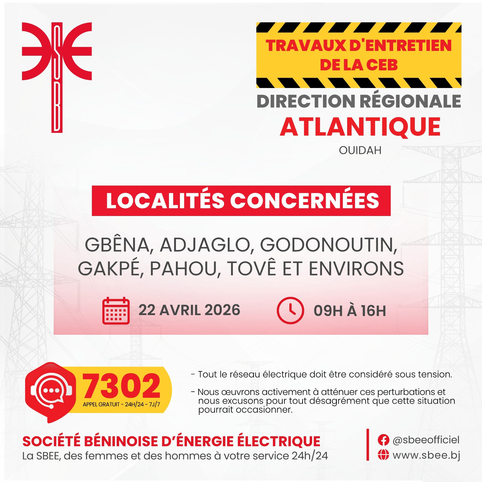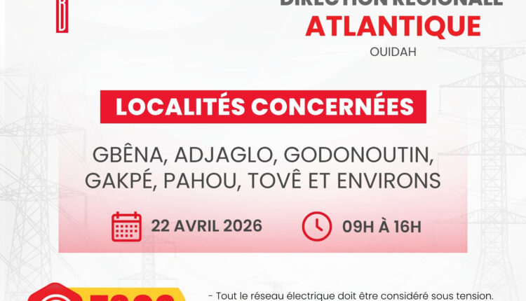 La Société béninoise d’énergie électrique (SBEE) informe ses abonnés d’une interruption temporaire de la fourniture d’électricité prévue ce mardi 16 avril 2026 dans plusieurs localités du pays.