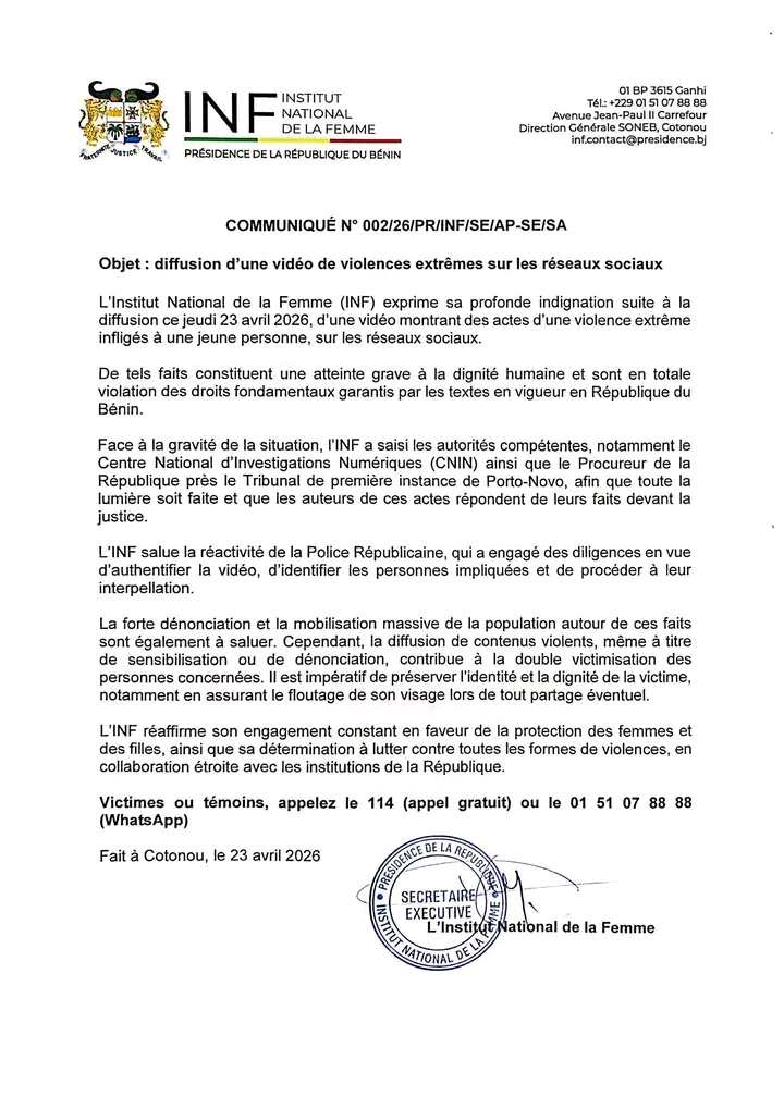 Selon le communiqué officiel, ces images constituent une violation flagrante des droits fondamentaux garantis par les lois en vigueur en Bénin. Face à la gravité des faits, l’INF a immédiatement sollicité l’intervention du Centre National d’Investigations Numériques (CNIN) ainsi que du procureur de la République près le tribunal de première instance de Porto-Novo.