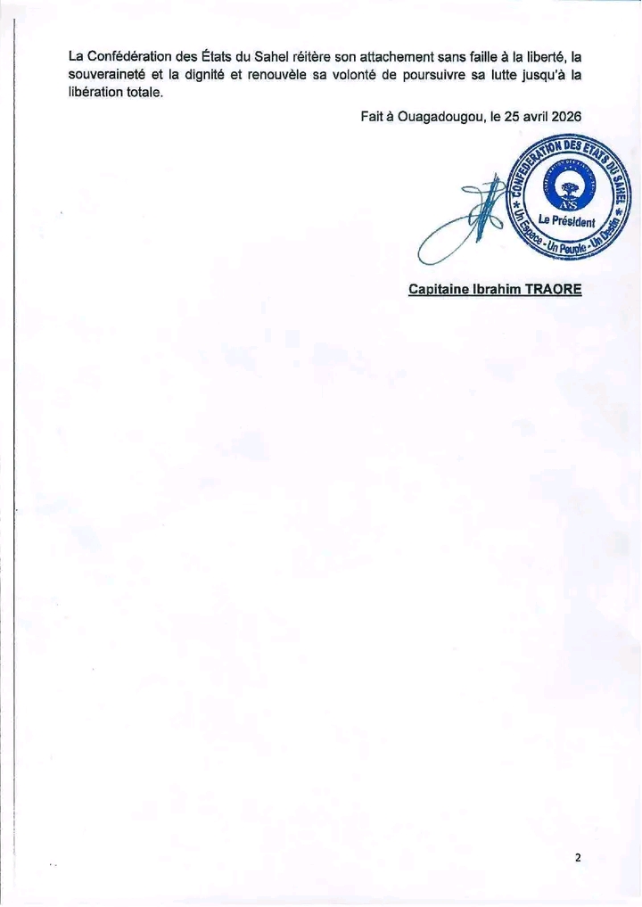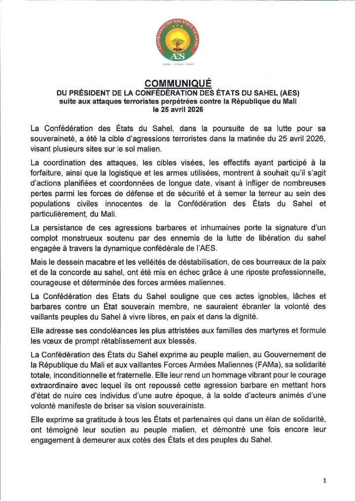 La Confédération des États du Sahel (AES) a fermement condamné, ce 25 avril 2026, une série d’attaques terroristes coordonnées visant plusieurs sites sur le territoire de la Mali. Dans un communiqué officiel, l’organisation régionale affirme que ces actes « ignobles, lâches et barbares » ne sauraient entamer la détermination des peuples sahéliens à vivre « libres, en paix et dans la dignité ». Selon l’AES, les assauts, menés dans la matinée, présentent toutes les caractéristiques d’une opération minutieusement planifiée.