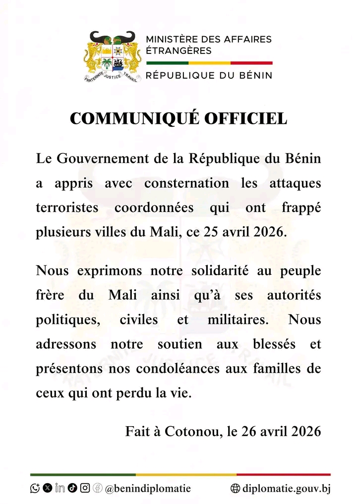 Le Bénin exprime son soutien au peuple malien, suite aux attaques terroristes de villes du Mali. En effet des groupes armés, ont attaqué simultanément plusieurs casernes et camps militaires à Kati, près de Bamako, à Sevaré, Gao et Kidal. L’armée malienne a confirmé ces attaques et précisé que les combats étaient encore en cours. A travers une note en date de dimanche 26 Avril, le ministère des affaires étrangères condamne les attaques et a exprimé son soutien aux familles éplorées.